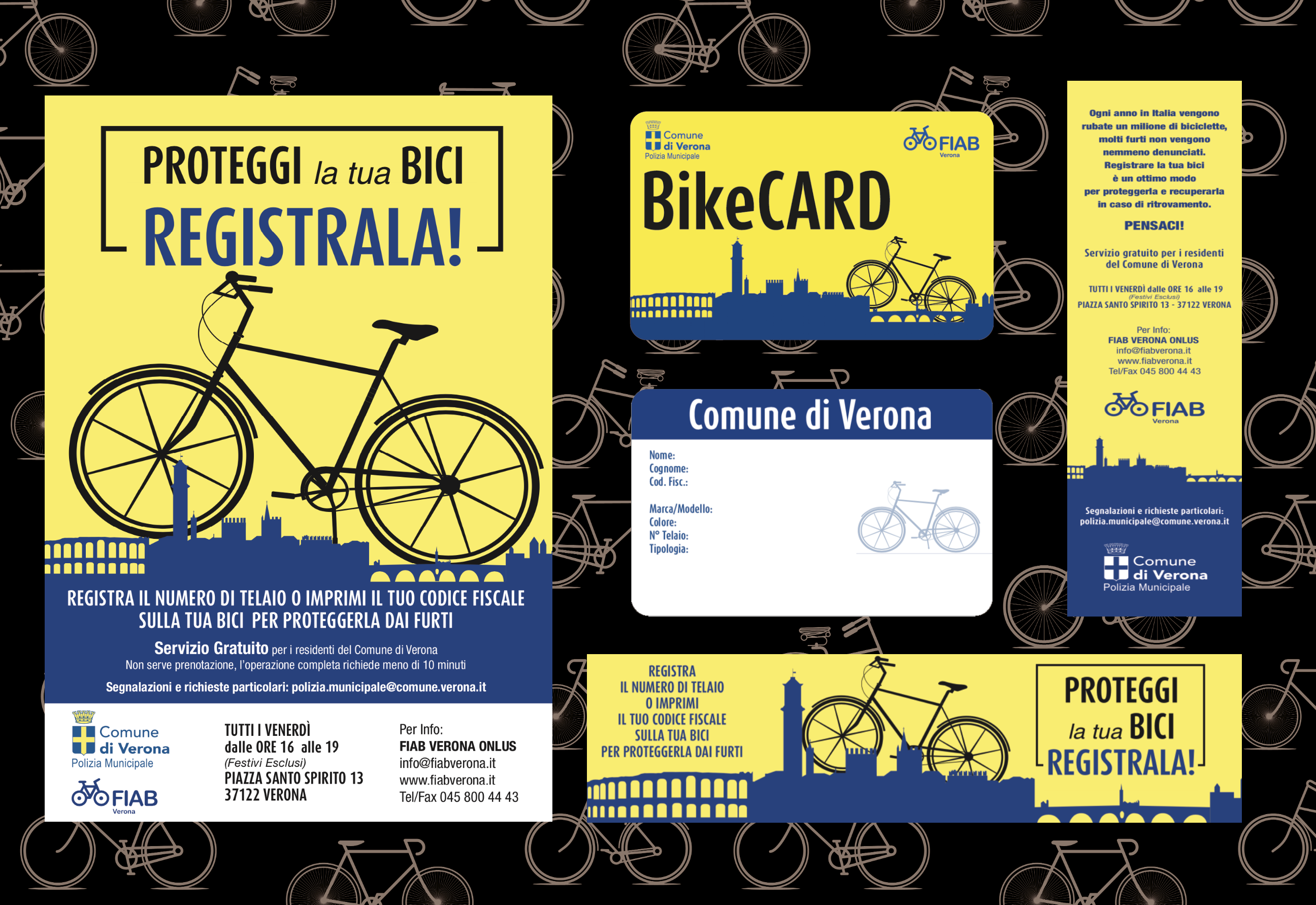 Campagna per informare la cittadinanza sull’attivazione di un nuovo servizio: punzonatura del codice fiscale sulla bicicletta e registrazione nel database comunale, così da rendere possibile la restituzione della bici al proprietario in caso di furto/ritrovamento. Sono stati studiati graficamente e realizzati volantini, segnalibro, locandine e adesivi.