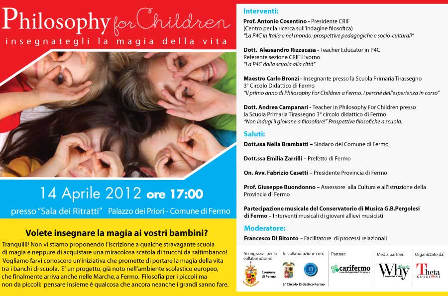 Un evento patrocinato dal Comune e dalla Provincia di Fermo che è arrivato per la prima volta nelle Marche volto a portare la magia della filosofia tra i banchi di scuola. Filosofia intesa non come materia ma come metodologia che permette agli alunni di confrontarsi su vari temi della vita. Temi come l’amicizia o la libertà, per fare alcuni esempi. Si è trattato di un vero e proprio momento formativo per gli alunni ma anche per gli stessi insegnanti. L’evento è stato presentato in conferenza stampa e poi è stato portato all’interno del Palazzo dei Priori di Fermo con un invito ben accolto da dirigenti, docenti delle scuole di ogni ordine e grado, bambini, ragazzi e famiglie.